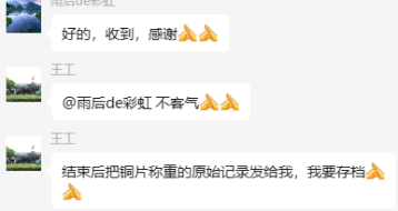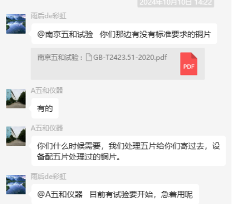 為了更好地說明銅片試驗的重要性,下面分享一個檢測公司的銅片試驗實際案例:2024年8月份合肥******檢測技術(shù)有限公司第一次采購我司一臺型號為“WHQ-300B”型的混合氣體腐蝕試驗箱,設(shè)備被運送到客戶指定的場地安裝調(diào)試運行。安裝調(diào)試后,客戶后期自行進(jìn)行一次銅片增重試驗,我司技術(shù)人員進(jìn)行線上指導(dǎo)操作,試驗結(jié)束之后客戶將數(shù)據(jù)發(fā)給我司,以下是客戶和我司聊天記錄以及客戶做的數(shù)據(jù)信息: